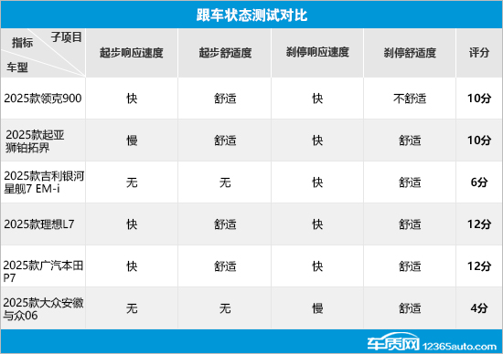 在跟车状态测试中,理想L7、广汽本田P7均获得满分,表现可圈可点。相比之下,大众安徽与众06的评分仅为4分,成绩垫底;吉利银河星舰7 EM-i的评分为6分,两者都和其余车型有较大差距,原因主要是不支持自动跟车起步功能,因此在起步响应速度和舒适度两项未获得分数。