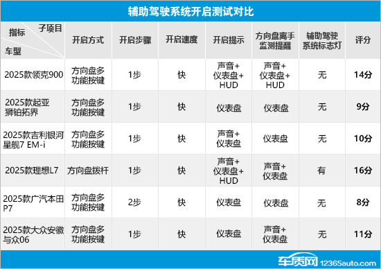 通过横向对比结果来看,除了2025款理想L7(以下简称:理想L7)采用方向盘拨杆开启外,其余车型均采用方向盘多功能按键开启。虽然开启方式有所不同,但只有2025款广汽本田P7(以下简称:广汽本田P7)的开启步骤需要2步,日常使用略显繁琐。值得一提的是,2025款领克900(以下简称:领克900)、理想L7不仅仪表盘上会有图标提示,还有声音提醒和HUD抬头显示提示,让驾驶员可以更清晰地了解到辅助驾驶状态。此外,6款车型均配备方向盘离手监测提醒功能,其中领克900提供三种提醒方式,表现相对更好。辅助驾驶系统标志灯方面,理想L7是唯一配备该功能的车型,可以给其他道路参与者明显的提示,值得点赞。