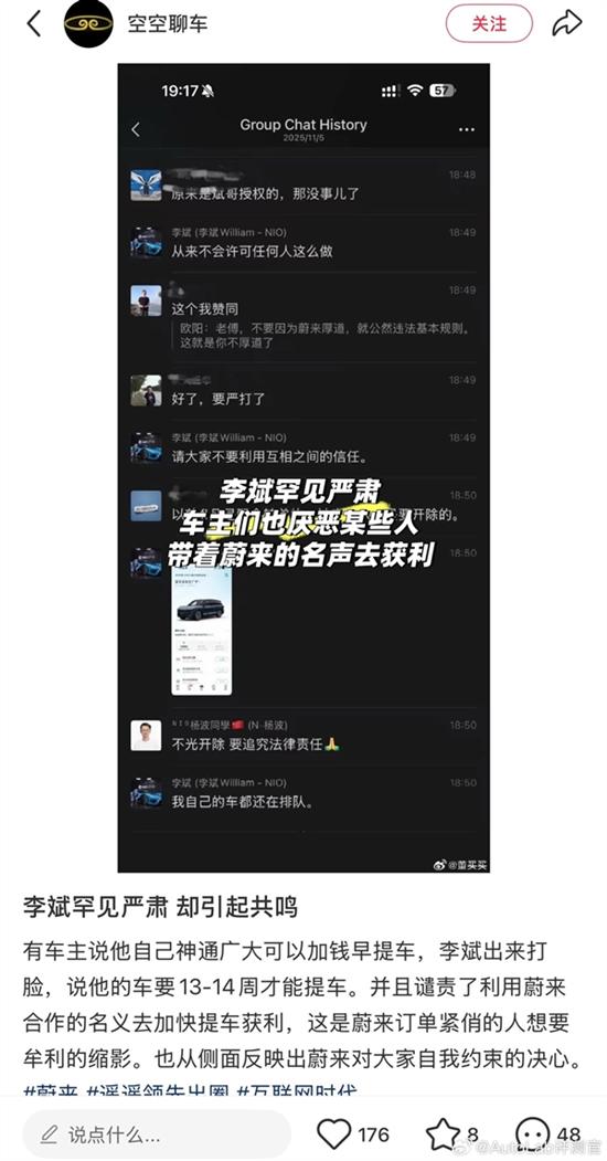 李斌称,蔚来从不许可任何人可以这么做,请大家不要利用互相之间的信任。