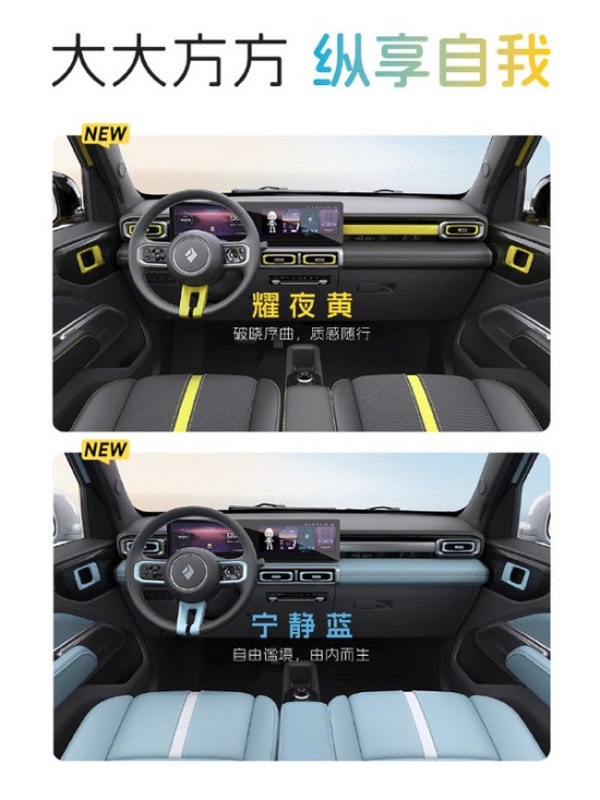 作为特别版车型,新车延续了现款车型方正的造型设计,最大变化在于配色,显眼包黄搭配暗夜黑外观套件,疗愈蓝搭配极光白外观套件,全系标配车身同色飞机涡轮造型轮毂,赋予了整车更多潮玩属性。新车长宽高分别为3381mm*1685mm*1721mm,轴距2110mm,最小离地间隙150mm,最小转弯半径为4.6m。