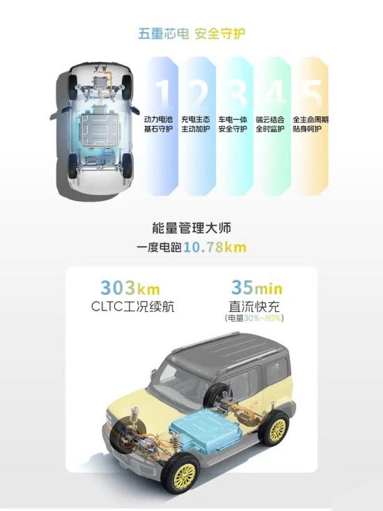 动力部分,新车继续采用后置后驱的驱动形式,搭载永磁同步电机,最大功率为50千瓦,峰值扭矩140牛·米,匹配磷酸铁锂电池组,纯电续航里程可达到303公里,直流快充模式下电量从30%充至80%仅需35分钟。