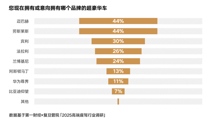 “共识”体现在传统豪门的绝对优势。白皮书(P22)调研显示,最受消费者欢迎的品牌是迈巴赫(44%)与劳斯莱斯(44%),两者并驾齐驱,以显著优势并列第一。
