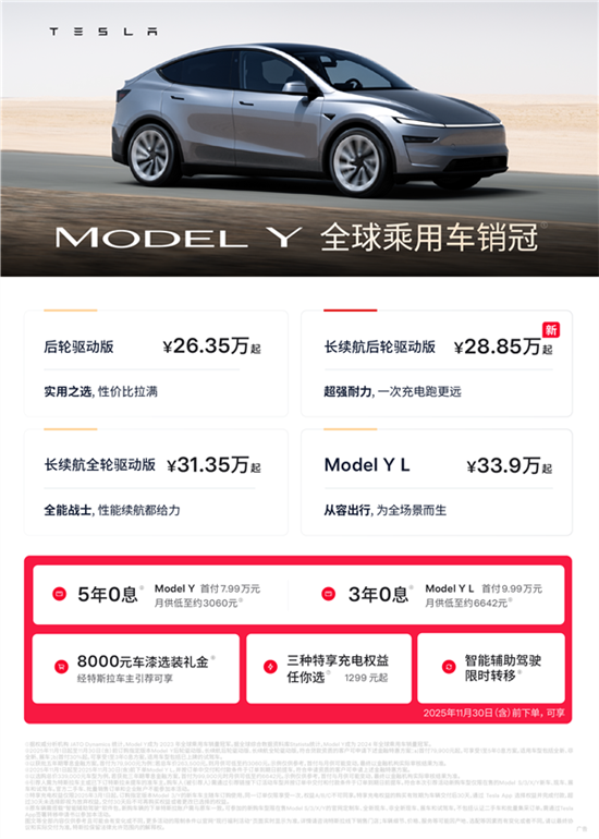 11月8日消息,特斯拉官宣Model Y长续航后轮驱动版上市开卖,官方指导价288500元,同时支持5年0息贷款,预计交付日期2-4周。