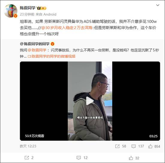 陈震直言:“坦率说,如果劳斯莱斯闪灵具备华为ADS辅助驾驶的话,我并不介意多花100w去买他……”