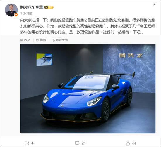 快科技11月8日消息,今天下午,腾势汽车总经理李慧宣布,超级跑车腾势Z目前正在欧洲跑纽北赛道。
