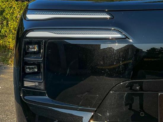 腾势N8L前灯组采用分层式布局,标志性的平行LED日间行车灯造型细窄,与腾势N9的灯组有明显区别,两侧设置有竖向布局的大灯组,为远近光分体式的大灯,非常有腾势家族的观感。