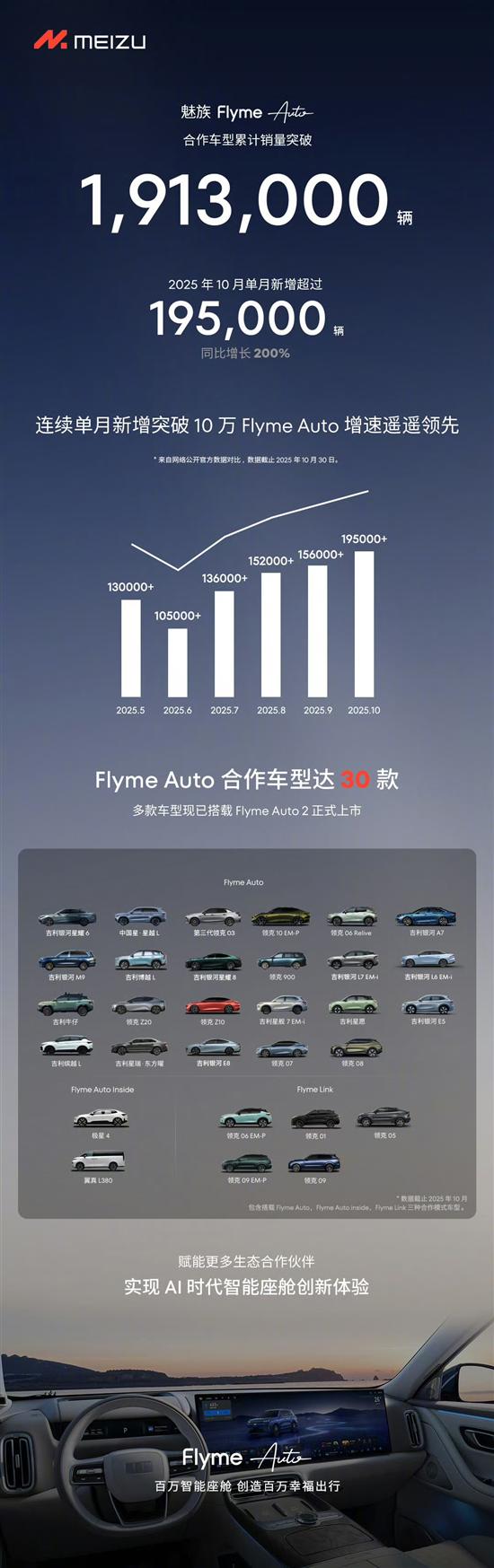 11月17日,魅族宣布,Flyme Auto 合作车型10月单月销量超过19.5万辆,同比增长 200%,连续多月单月新增突破10万。
