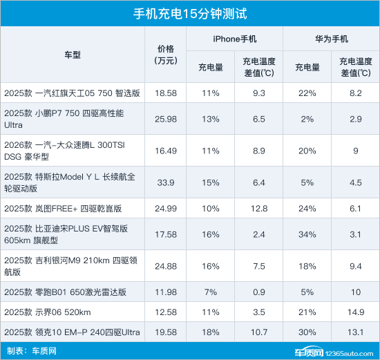 为了模拟真实的使用环境,我们采用苹果iPhone 13 Pro和华为P50 Pro两款手机作为固定测试机,车内环境温度设定在25-30℃。测试时,首先将两款手机的电量耗尽,并确保手机初始温度与车内环境温度保持一致,然后分别放置在车载无线充电板上充电15分钟,来测试其充电效率。充电结束后,查看并记录充电量,同时使用红外线测温仪对两款手机的背部进行测量,以测试机身发热量情况。