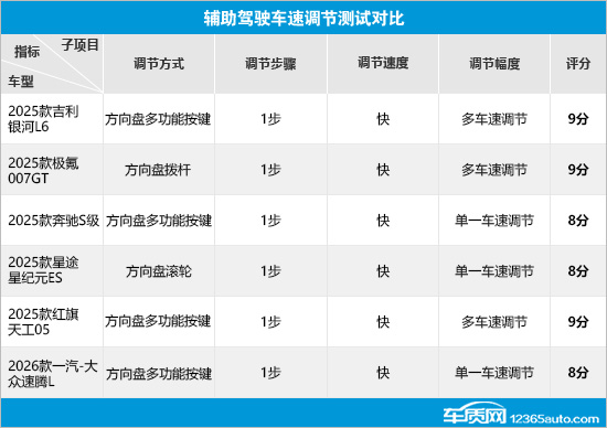 在车速调节项目中,6款车型的整体表现符合预期。虽然调节方式存在差异,但是在调节步骤和调节速度方面均表现一致。而在调节幅度方面,奔驰S级、2025款星途星纪元ES(以下简称:星途星纪元ES)和大众速腾L不支持多车速调节,导致出现失分情况。