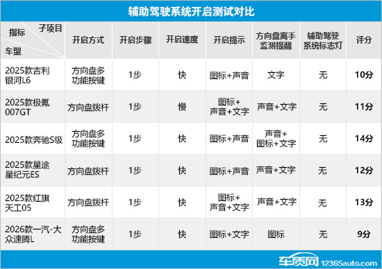 通过横向对比结果来看,2025款吉利银河L6(以下简称:吉利银河L6)、2025款奔驰S级(以下简称:奔驰S级)和2026款一汽-大众速腾L(以下简称:大众速腾L)采用方向盘多功能按键开启,其余车型均采用方向盘拨杆开启。虽然开启方式有所不同,但所有测试车辆的开启步骤只需要1步,日常使用十分便利。但稍显可惜的是,2025款极氪007GT(以下简称:极氪007GT)的开启速度较慢,大众速腾L的开启提示和方向盘离手监测提醒均没有声音作为提示,表现相对较差。辅助驾驶系统标志灯方面,6款车均未配备该功能,不能给其他道路参与者明显的提示,后期值得优化。