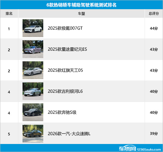 通过此次横评可以发现,极氪007GT在激光雷达与ZEEKR AD辅助驾驶系统的加持下,成为6款车型中得分最高的选手,表现符合预期。星途星纪元ES与红旗天工05的表现同样均衡,均取得43分,以微弱差距并列第二。大众速腾L在最近跟车距离方面表现相对保守,并在多个测试项目中出现失分,最终只得到39分,是唯一低于40分的车型。当然,参与横评的6款车型在辅助驾驶系统测试中或多或少都存在一些问题,希望厂家在后续的车型升级中持续优化改进,为车主带来更加安全便捷的辅助驾驶体验。