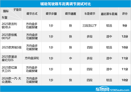 在跟车距离项目对比中,星途星纪元ES和吉利银河L6的表现相对较差,前者的调节速度不够快,而后者只支持三段及以下车距调节,选择不够灵活。在最近跟车距离方面,吉利银河L6、奔驰S级和大众速腾L的表现比较保守,会经常出现被其他社会车辆加塞的情况,很大程度影响了通勤效率。极氪007GT则表现优异,不仅调节步骤少、速度快,还支持多段调节且最近跟车距离适中,最终拿到了这一环节的满分。
