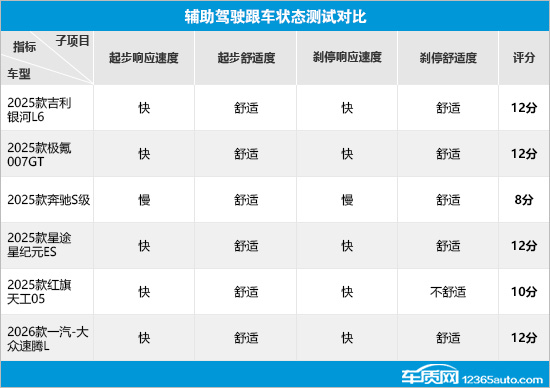 在跟车状态测试中,仅奔驰S级和2025款红旗天工05(以下简称:红旗天工05)没有获得满分。奔驰S级因起步和刹车响应速度均较慢,最终仅得到8分,成绩垫底;红旗天工05则由于刹停不舒适导致丢分。