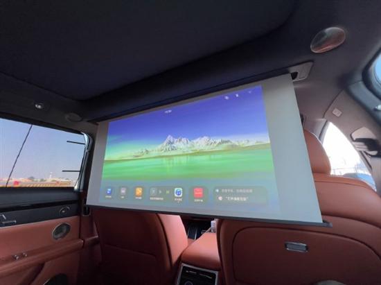 如果同行的家人想在后排观看视频,只需三指隔空投屏,就能将中控屏上的视频内容投送到二排的32英寸投影幕布上。这款投影幕布隐藏在车顶,需要使用时会自动降下,幕布尺寸宽大,显示效果清晰,即便在白天也能呈现出鲜艳的色彩。