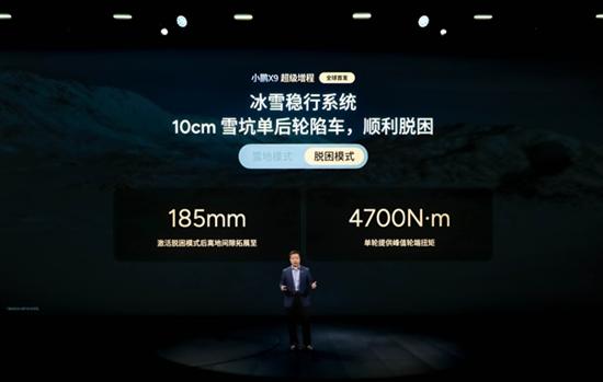 在脱困模式下,小鹏X9超级增程更可输出4700N·m单轮峰值扭矩,轻松应对10cm深雪坑陷车。