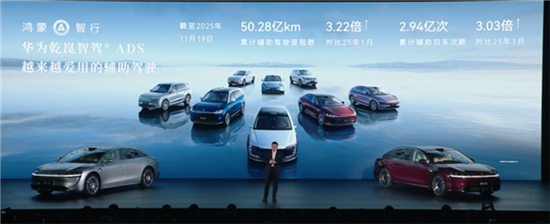 余承东宣布:截至2025年11月19日,其累计辅助驾驶里程已突破50亿公里,达到50.28亿公里,同比2025年1月增长3.22倍;累计辅助泊车次数达2.94亿次,同比增幅达3.03倍。