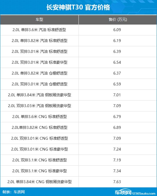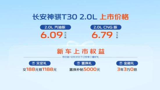 日前,我们从长安凯程官方获悉,长安神骐T30 2.0L正式上市,售价为6.09万元起和6.79万元起。新车搭载东安2.0L发动机,燃油最大功率110kW,燃气最大功率95kW。