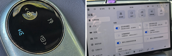 评测车支持无钥匙进入功能且选装了遥控钥匙,驾驶者携带遥控钥匙靠近车辆时就能解锁,锁车时只需远离车辆便会自动上锁;同时,还可以使用卡片钥匙在左侧外后视镜上方进行感应开启。实测解锁和落锁过程都比较顺畅,并未出现失灵或是卡顿的情况。另外,评测车还支持蓝牙钥匙进入方式。