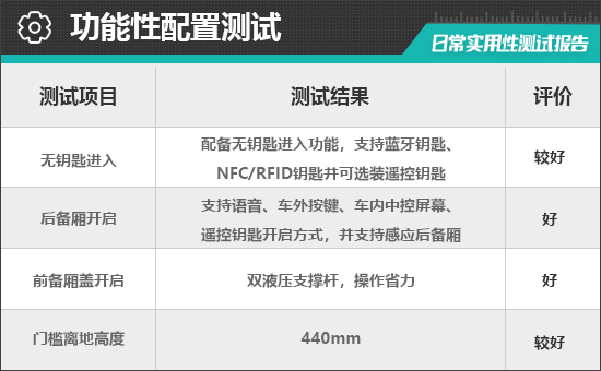 评测车的后备厢尾门支持语音、车外按键、车内中控屏幕、遥控钥匙等多种开启方式,并且具备感应后备厢功能,操作简便,确保了实用性。
