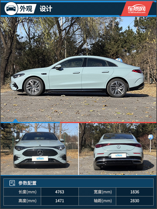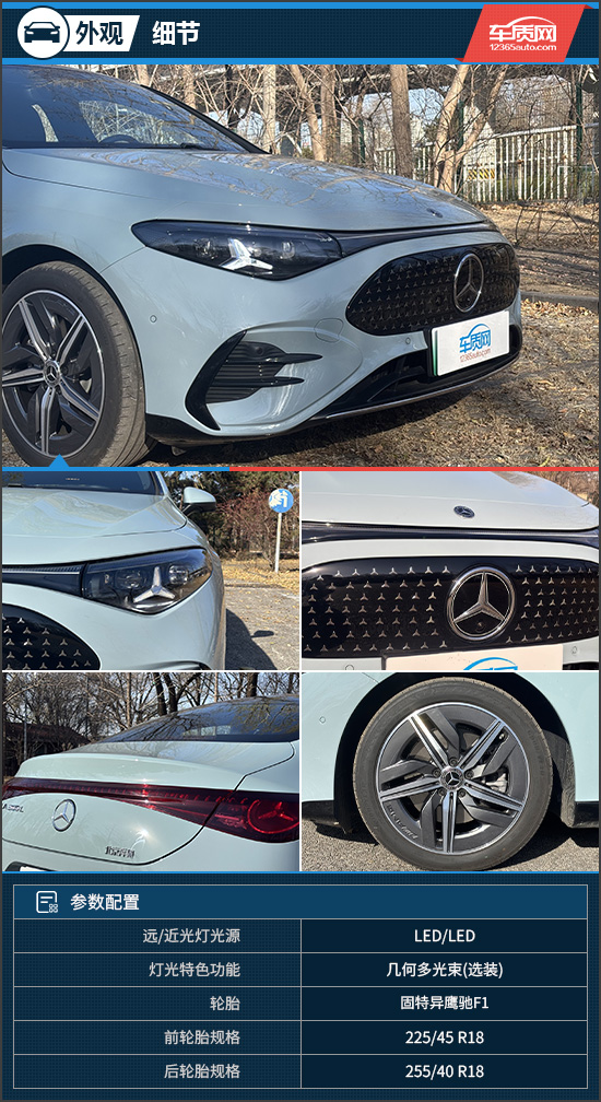 作为一款纯电车型,评测车在设计层面展现出明显的突破性。外观采用电动数字时代的全新设计语言,前格栅由142颗可独立点亮的LED三叉星徽与中央星徽盾标组成,搭配贯穿式星环灯带和两侧多边形大灯组,视觉观感焕然一新。前雨刮支持强力清洁模式,可在雨雪或泥沙工况下确保更清晰的驾驶视野。值得一提的是,它还是奔驰首款使用前备厢的纯电车型,容积为101L,日常可放置一些零散物品。