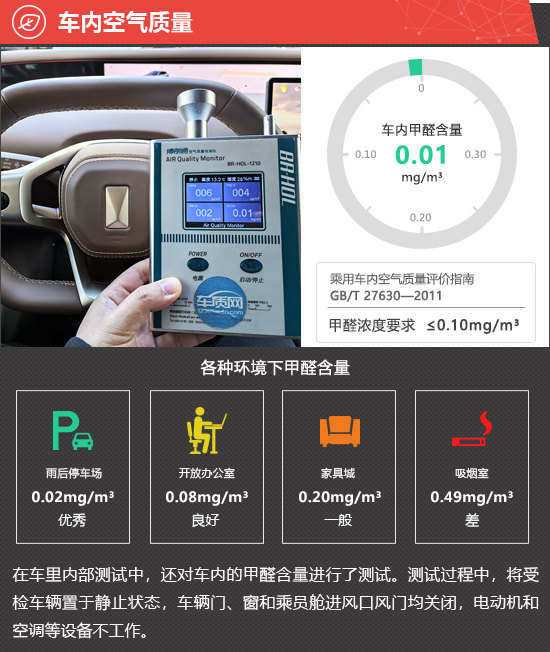 在车内空气质量测试环节,将车辆放置在车辆较少的内部地面停车场中,实测2026款阿维塔07纯电版的车内甲醛含量为0.01mg/m3,符合2012年3月1日起实施的,由原环保部和国家质量监督检验检疫总局联合发布的《乘用车内空气质量评价指南》(中华人民共和国国家标准GB/T 27630-2011)中的相关标准。