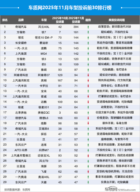 数据显示,本月车质网受理的有效投诉信息共涉及908款车型,其中投诉达两位数(含)以上的车型共242款。此外,车质网本月共接到车企针对投诉的回复18,179条(含部分之前月份投诉的回复)。在去除投诉人因为车企解决得当而自愿申请撤诉的信息后,2025年11月投诉量前30的车系(车型)排名如下: