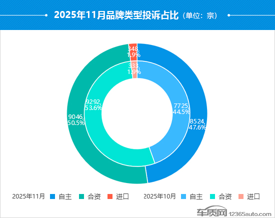 据国内领先的缺陷汽车产品信息收集和汽车消费者投诉信息受理平台车质网统计,2025年11月共受理车主有效投诉信息17,961宗(其中含第三方平台和后装轮胎投诉共43宗),环比上涨3.3%,同比上涨33.6%。今年1-11月累计投诉量创纪录地突破20万宗,较去年同期上涨32.3%。