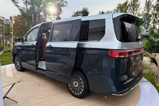 侧面造型采用典型的MPV车身比例,内凹式腰线与隐藏式侧滑门滑轨形成更为整体、简洁的视觉效果。双色车身搭配多辐式轮毂,使侧面更具高级感与精致度。尾部同样以稳重方正的结构为主,贯穿式尾灯与镀铬饰条结合,进一步提升层次感与辨识度。
