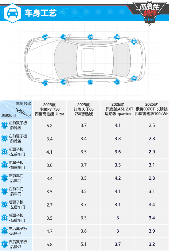 在车身工艺环节,从测试结果来看,极氪007GT整体表现最好,各部位的缝隙均值都控制在4mm以内。不过,两侧后翼子板与后备厢连接处左右缝隙均值相差稍大,对测试成绩还是产生了一定影响。奥迪A5L与极氪007GT的情况类似,只是其有个别部位的缝隙均值超过了4mm。相比之下,小鹏P7不仅左前翼子板与前舱盖连接处、两侧后翼子板与后备厢连接处缝隙均值偏高,而且个别部位还存在两侧缝隙均值相差较大的情况,最终导致失分较多。
