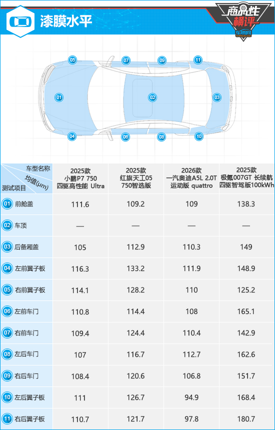 在漆膜水平环节,从测试结果来看,极氪007GT以较大优势领先另外三款车型。除了右前翼子板处的数值相对较低外,其余关键部位的测试数值均比较接近,整车漆膜平均厚度达到同级别车型中上游水平。红旗天工05全车各测试点之间数值浮动不大,漆膜喷涂均匀性表现不错,只是漆膜厚度仍存在提升空间。小鹏P7和奥迪A5L整车漆膜平均厚度均处于同级别车型中下游水平,前者漆膜厚度表现一般,后者是整车漆膜厚度和喷涂均匀性都有待提升。