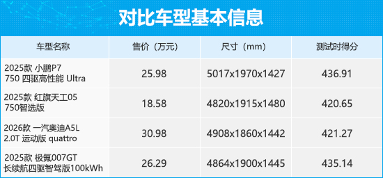 在汽车行业竞争白热化与消费升级的双重驱动下,价格实惠、空间宽敞、配置丰富的车型正在逐渐成为家庭用户的新宠。随着自主品牌不断崛起,即便是曾经不可一世的豪华品牌,也不得不放低身段卷入“价格战”。在往期的新车商品性评价中,我们曾经测试过多款运动风格家用轿车。今天我们从中挑选了四款车型,它们分别为小鹏P7、红旗天工05、一汽奥迪A5L(以下称:奥迪A5L)以及极氪007GT。本文将通过各项测试数据对比,看看哪款车在商品性方面的表现更加出色。