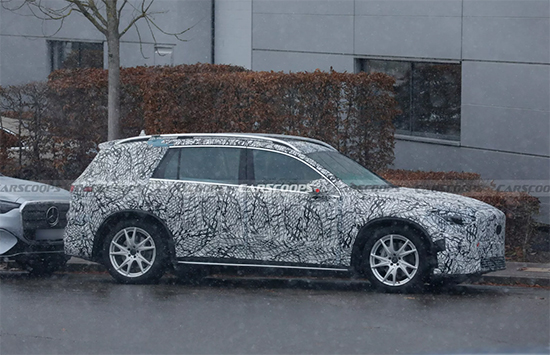 车身侧面,新车整体造型方正,车顶线条平直。根据以往惯例来推测,新车的D柱和尾部三角窗造型将会进行重新设计,以获得更大的车内空间。此外,新车还配备车顶行李架和隐藏式车门外拉手。和前灯组一样,新车的尾灯组内部同样融入了三叉星徽元素,尾窗中央配备高位刹车灯。车身尺寸方面,新车会在纯电GLC五座版的基础上有所提升,后者的长宽高分别为4845mm*2089mm*1644mm,轴距2972mm。