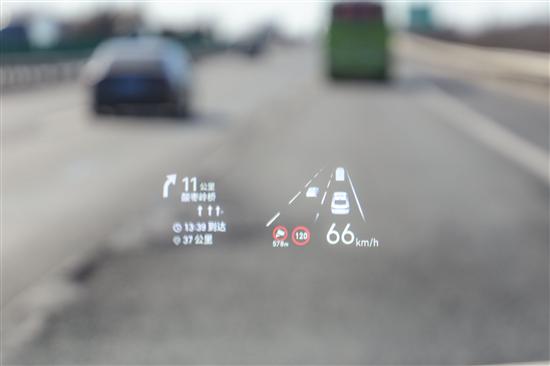 13.8英寸的HUD抬头显示,HUD亮度达到了12000nits亮度,对比度1200:1,从实际体验来看,即便在直射阳光下依然能够提供清晰可见的图像和信息。可显示车速、导航、红绿灯倒计时、电话、三车道前车识别等信息。