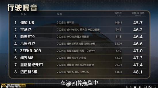 而在行驶噪音测试中,小米YU7同样表现亮眼:前排噪音值46.6dBA,位列榜单第4,仅次于仰望U8(45.7dBA)、宝马i7(46.2dBA)、蔚来ET9(46.4dBA),超越迈巴赫S级等豪华车型。