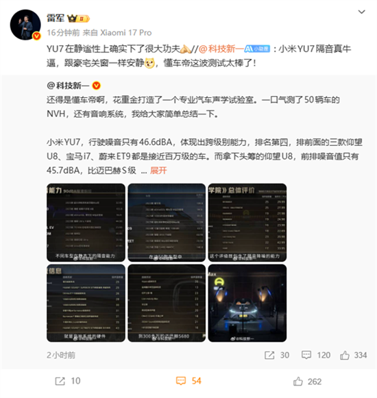 雷军转发了这一成绩,并表示:“YU7在静谧性上确实下了很大功夫。”