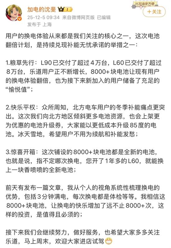 对此,蔚来高级副总裁兼乐道汽车总裁沈斐发文称,用户的换电体验始终是乐道汽车关注的核心焦点之一。此次电池翻倍计划,正是乐道汽车兑现“补能无忧”承诺的举措之一,具体体现在以下三大方面: