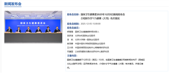 据国家卫生健康委网站消息,今日,国家卫生健康委举行新闻发布会介绍时令节气与健康(大雪)有关情况。