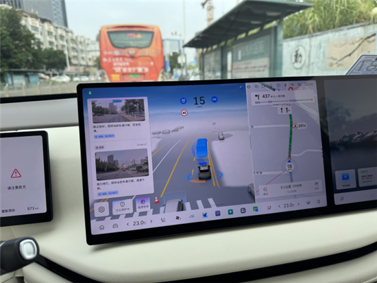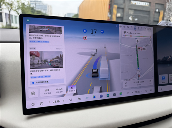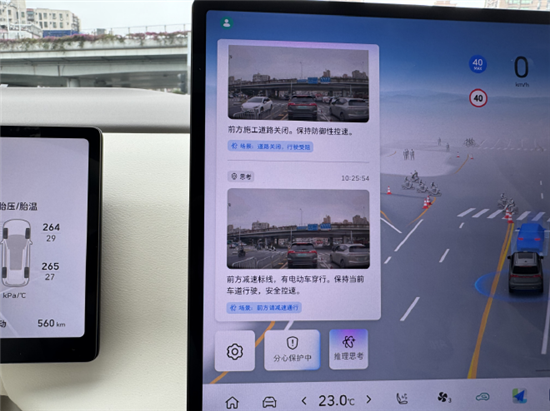 更让我们惊喜的,是车内新增的CoT思维链卡片。以往大多数辅助驾驶系统如同一个“黑箱”,用户难以知晓其决策逻辑,这种不确定性往往削弱了使用信心。而在这套VLA系统中,车辆将自身的思考过程实时可视化——从感知环境、推理路况,到决策执行,每一步都清晰呈现在屏幕上。尤其在识别到风险区域或视觉盲区时,画面中还会重点标注,让你一眼看懂系统为何减速、为何变道。