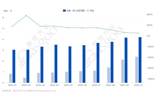 其次,海外业务的快速增长为部分车企带来了增量外溢。奇瑞、比亚迪等企业在今年持续扩大海外出货与终端布局,奇瑞单月出口已突破10万辆规模,1-11月出口量高达120万辆,占总销量比重接近五成。
