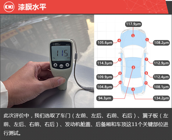 在漆膜水平测试环节,通过测试结果可以发现,整车漆膜平均厚度约为111.1μm,在测试过的同级别车型中处于中下游水平。从各关键部位的测试数据来看,除后备厢和车顶外,其余部位的漆膜厚度相差不大,漆面喷涂均匀性表现尚可。