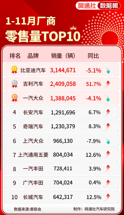 近日,乘联会发布的1-11月厂商零售量数据揭榜。在五家自主品牌中,吉利汽车、长城汽车、奇瑞汽车、长安汽车均保持强劲的增长势头。其中,吉利汽车同比增长51.7%,成为销量增速最快的企业。 合资车企中,上汽通用五菱以12.6%的同比增长领跑,广汽丰田同比微增0.4%。 责任编辑:枯川 10 网友评论 您需要登录后才可以评论,登录| 注册 用户登录 用户名 密码 下次自动登录 忘记密码 没有账号 马上注册 使用第三方账号登录 QQ账户 新浪微博 腾讯微博 绑定手机 手机号码 验 证 码