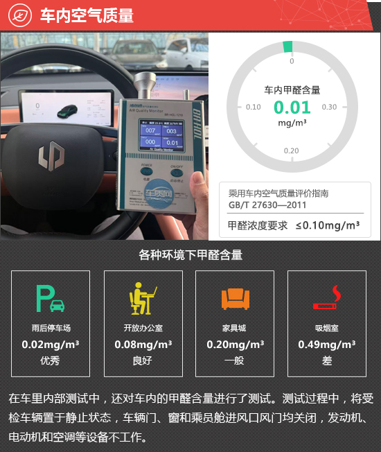 在车内空气质量测试环节,将车辆放置在车辆较少的内部地面停车场中,实测车内甲醛含量为0.01mg/m3,符合2012年3月1日起实施的,由原环保部和国家质量监督检验检疫总局联合发布的《乘用车内空气质量评价指南》(中华人民共和国国家标准GB/T 27630-2011)中的相关标准。