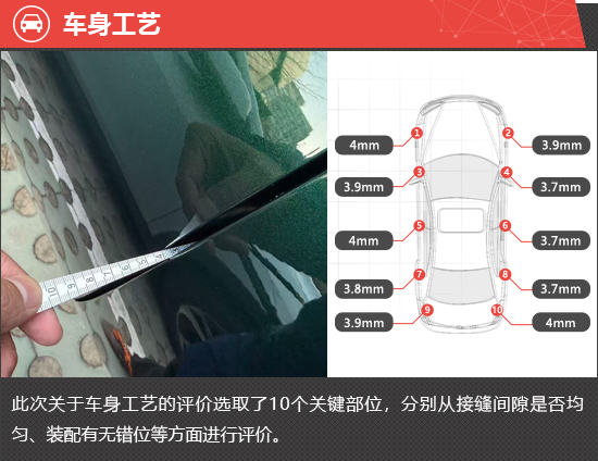 在车身工艺测试环节,整车共选取10个关键部位,每个关键部位都会选取3个关键点进行测量,以评价各关键部位缝隙的均匀程度。从测试结果来看,全车绝大多数关键部位的缝隙均值控制合理,且左右两侧的缝隙差值较小,整体表现可圈可点。