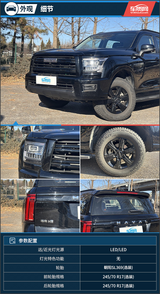 车身侧面线条刚劲有力,外扩式轮眉强化了硬派气场,窗框饰条与车顶行李架均采用亮黑涂装。同时,26°接近角、24°离去角搭配225mm最小离地间隙,赋予车辆较强的全路况通过能力。车尾延续黑色运动主题,饰条、后包围与仿排气装饰相呼应,整体呈现出“一黑到底”的视觉效果。此外,车辆配备“劈波斩浪”轮毂,并选装朝阳SL369系列AT胎,可适应野外复杂路况,规格为245/70 R17。