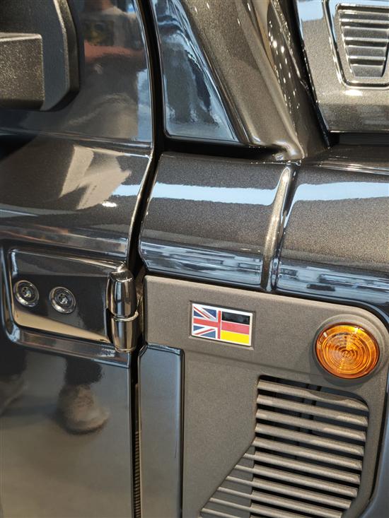 你能在两个大圆灯中间看到两盏有点突兀又有点憨态可掬的探照灯,在机盖上看到“Powered by BMW”,在翼子板上看到一半英国国旗一半德国国旗拼凑的图案,这或许代表着“英国血统”和“德法边境制造”吧。走到车尾,看到的是一对圆圆小小的、高度集成各种灯具功能的尾灯,外挂备胎、观音门和方正的车体形成了奇妙的反差感。
