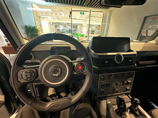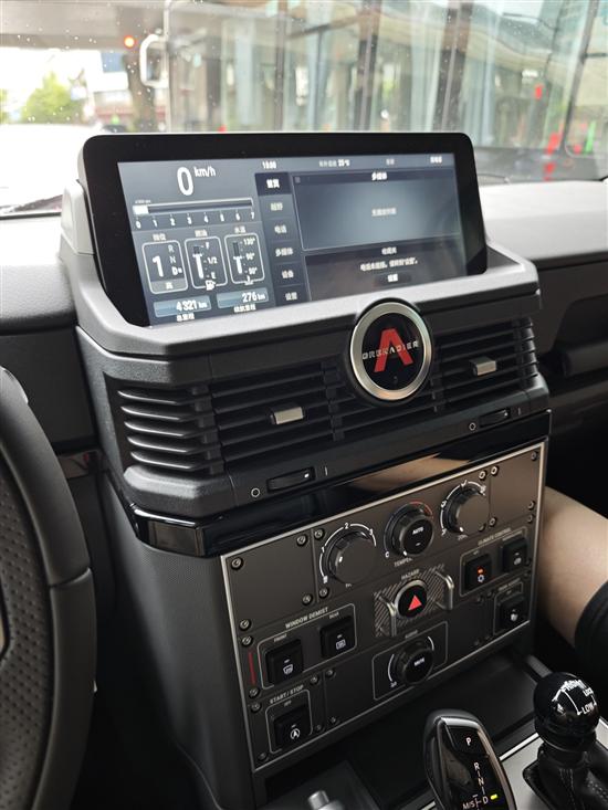 当你驾驶它时,一定会想看一看仪表信息,而这些都已经集成到了中央大屏里。虽然是全数字化的呈现形式,但信息的丰富度十分到位,在一个名为“越野”的菜单里,你能看到你能想到、自己所需要的所有信息。在挡把后方,还有一组类似于早期MMI的集成化快捷操作钮,虽然手感很不好,但功能是给到了。这个车机甚至还全部进行了汉化,可以感受到厂家对中国市场的认真对待。