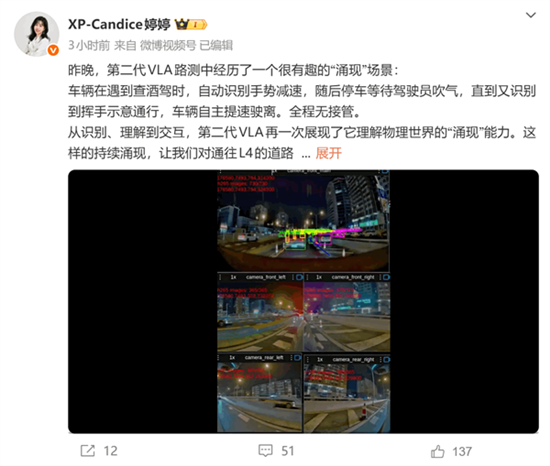 小鹏汽车自动驾驶产品高级总监“@ XP-Candice婷婷”也发文透露称,小鹏第二代VLA车辆,在昨晚路测中经历了一个很有趣的“涌现”场景: