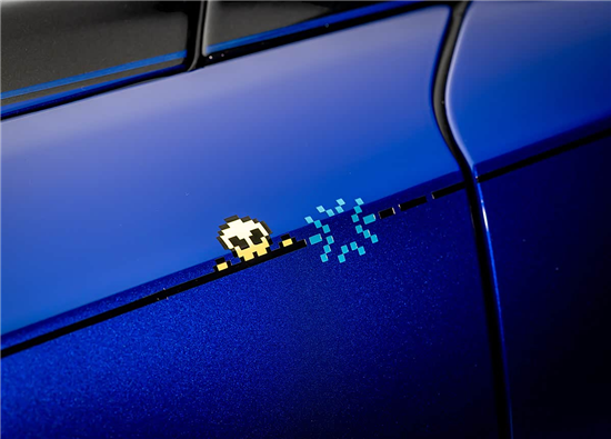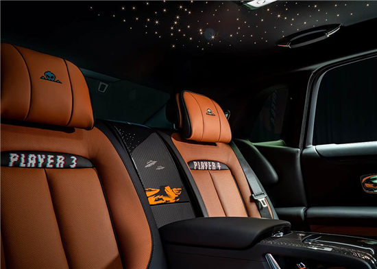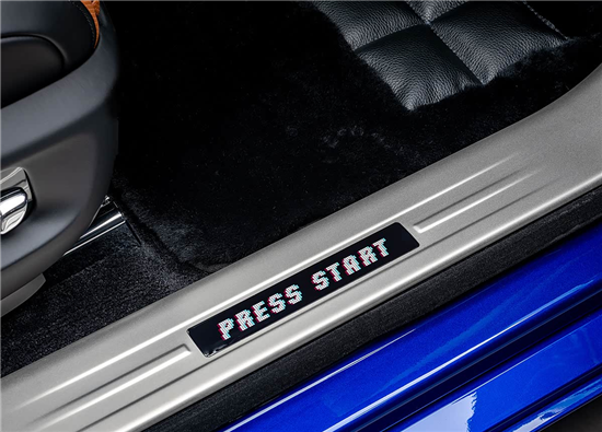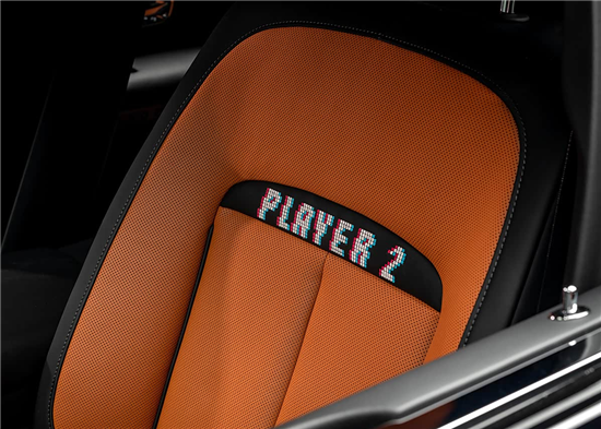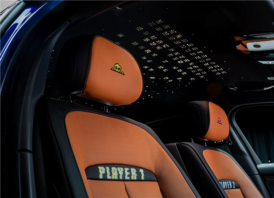 内饰部分,新车采用黑色与深棕色搭配。座椅采用Bespoke高级定制刺绣,前排绣有“Player 1”和“Player 2”,后排则为“Player 3”和“Player 4”,以8位像素风格的字体呈现,同时每个头枕处也有“顽皮外星人”刺绣。