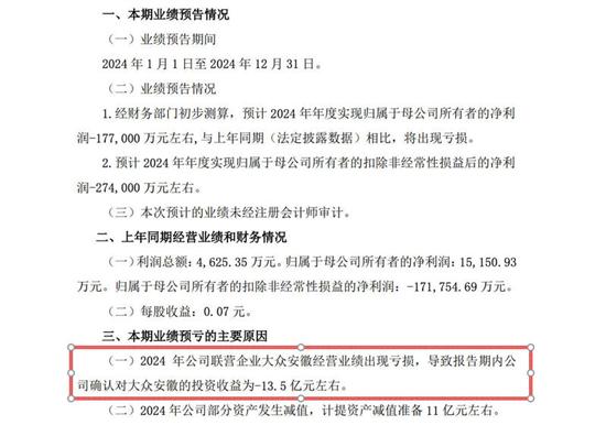 根据江淮汽车(600418.SH)2024年年度业绩预亏公告,公司2024年年度由盈转亏,亏损主要原因之一是2024年公司联营企业大众安徽经营业绩出现亏损,导致报告期内公司确认对大众安徽的投资收益为-13.5亿元左右。