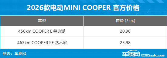 日前,2026款电动MINI COOPER正式上市,共推COOPER E经典派、COOPER SE艺术家两款配置。价格方面,新车建议零售价20.98-23.98万元,即日起至2025年12月31日,限时礼遇价低至15.38-18.78万元,还可叠加多重福利:指定车型车身颜色加装费至高全免6000元、享至高8000元选装包抵扣金;金融方案支持首付0元起,年利率低至4.28%(约合年费率2.26%),忠诚客户更有6年长悦保养套餐,个人预订/提车可获826 COOPER币。